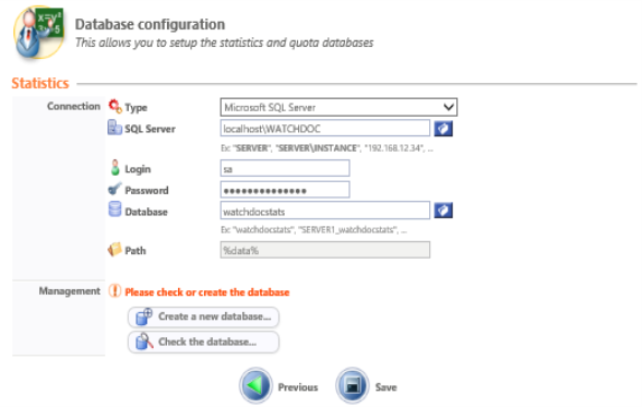 Check the database... : click on this button when reinstalling Watchdoc and if the statistics database is already installed.