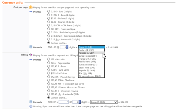 Profiles: Choose the format for displaying the payments or billing charges applied to printing. You have a choice between a number of preset formats or the ability to setup your own format. This display format is applied in the Watchdoc interfaces that provide information on the price of printing (especially in the user interfaces).