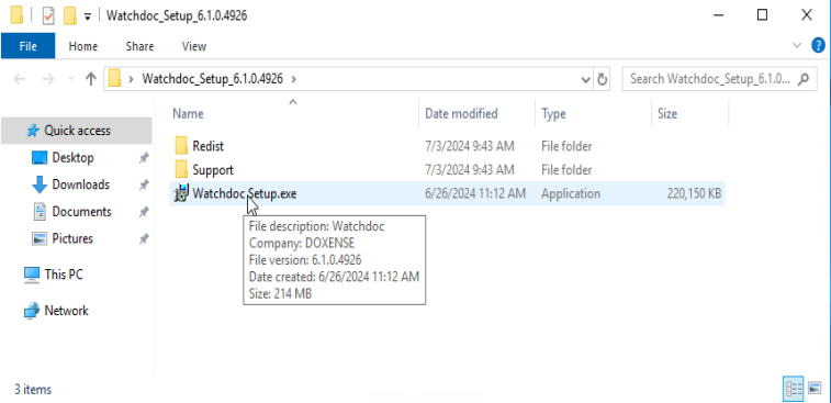 The setup tool is stored in an archive file named Watchdoc[…].zip, which must be unzipped in a folder of the server: