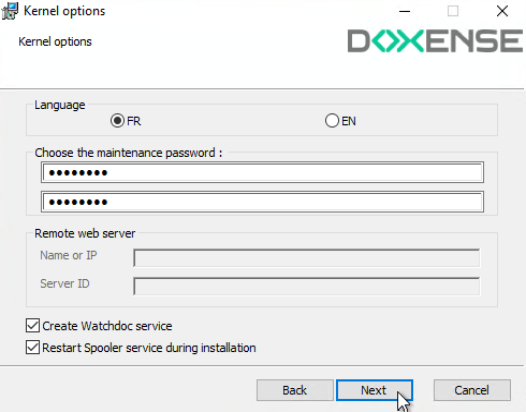 tick the box Create Watchdoc Service to install Watchdoc with the default options. If it's a cluster installation, untick the box;