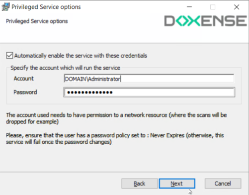 The Privileged Service component is associated with the use of WEScan's "ScanToFolder" destination. To be activated, this destination requires a service account (whose password never expires) with read and write right to a folder on a network share. This allows WEScan to send the scanned documents to this network share folder. The user can then retrieve his scanned documents from this folder.