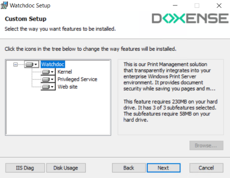 Use the Disk Usage button of the Custom setup interface to check that there is enough space left on the disk you have chosen to install Watchdoc :