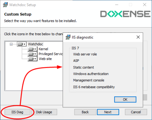 N.B.: If the WebSite component is missing in the list, it's because the IIS Web server role has been incorrectly set. In this case, click the IIS Diag button to display the list of installed ISS components. If a component is displayed in grey, it is missing. You should correct the problem (in the server manager) before restarting the installation of the Watchdoc website :