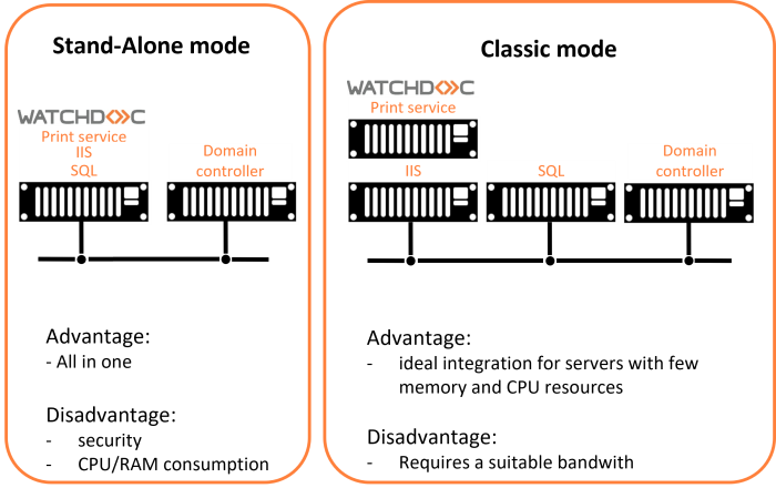 In a Stand-alone or in a Classical mode, the Watchdoc kernel and web site (IIS) features are hosted on the same server.