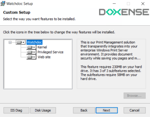 click on Browse and select a new installation path. The Disk Usage button is used to check that there is enough space on the drive you have chosen to install Watchdoc .