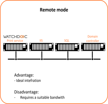 In a remote mode, the Watchdoc components kernel and web site (IIS) are hosted on different servers.