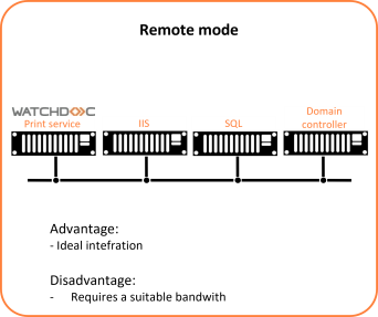The installation procedure varies depending on the mode you choose. In remote mode, you will need to install the Watchdoc website after installing Watchdoc.