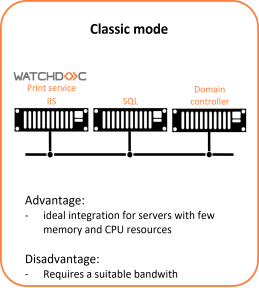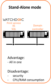 Watchdoc Standard can be installed in different modes depending on the number of servers available for the various services required to run Watchdoc. In all 3 cases, the domain controller is installed on a dedicated server: