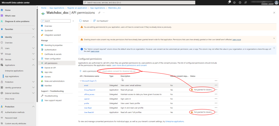 Once the authorisations have been added, they appear in the Configured permissions list, with the status Not granted...