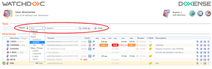 The Max column displays the maximum time lag observed, in milliseconds, for requests relating to the directory (since the Watchdoc service was started for since the cache reset action).