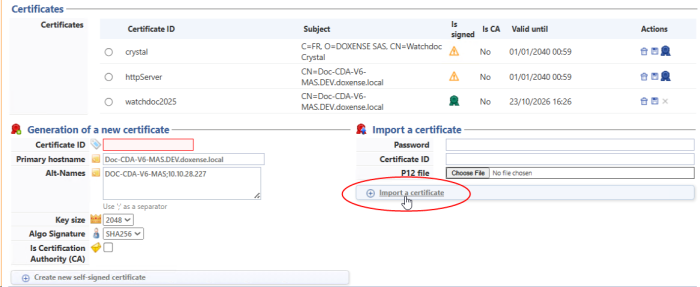 In the Certificates configuration interface, in the Generating a new certificate section, enter an ID identifier (unique and definitive);