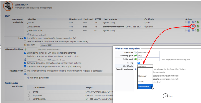 In the Web Server interface, DSP section, in the list of web server endpoints, add an endpoint or click the button to modify an existing endpoint: