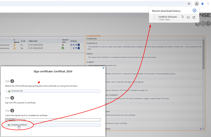 download the CSR file generated by Watchdoc (.pem) from the Download folder (by default);