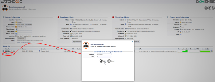 in the Add a slave server interface, enter the Watchdoc slave server address and port (DSP service port) ;