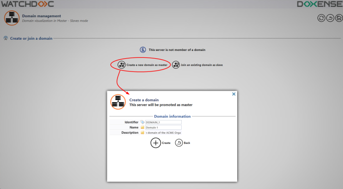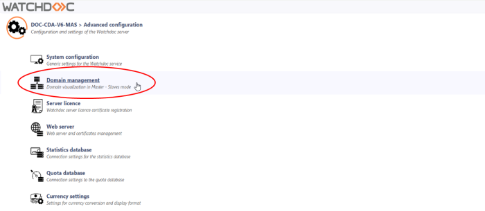 From Watchdoc v6, the master role can be declared from the Watchdoc administration interface > Advanced administration > Domain management.
