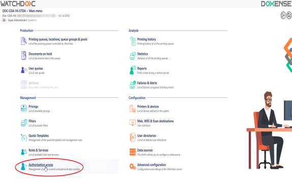 Log in to the Watchdoc administration interface using an administrator's account with the required authorisation to configure access rights.