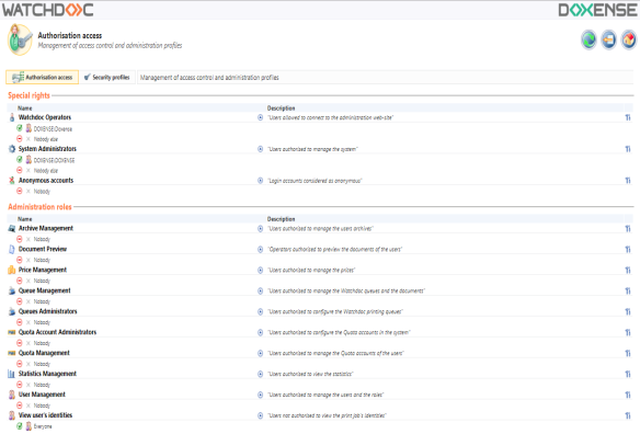 Administrator Roles: these are declared in the Watchdoc application (see Managing Roles), and are specified in the predefined list of possible administration actions that can be performed in Watchdoc.