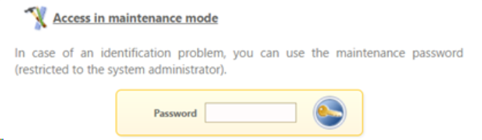 access in maintenance mode: this access method is dedicated to the systems administrator with administrator rights for all Watchdoc functions. The password for this access mode is defined during product installation.