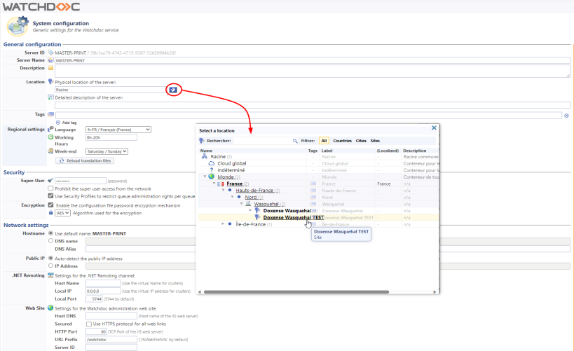 In the System configuration interface, General configuration section, Location parameter, click the button to browse the location tree;