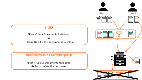 The following rule states that colour documents are not allowed on the queue and are therefore deleted.