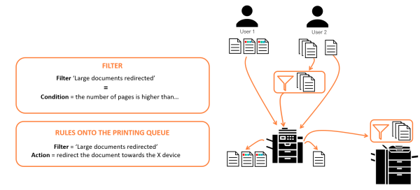 The following rule states that documents exceeding a certain number of pages cannot be printed in the queue. These jobs are therefore redirected to a queue optimised for large print jobs.
