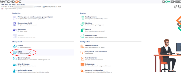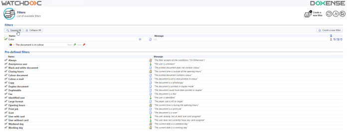 The Filters section displays the list of filters configured in your instance of Watchdoc. The