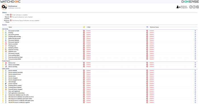 Service operation error: if the system is unable to execute a scheduled task relating to Watchdoc, is unable to contact the database or if the MS Windows spooler is faulty;