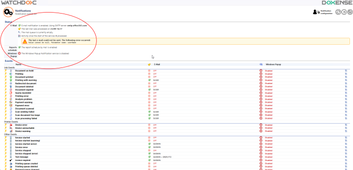 Notifications - Allow e-mail notifications: Check the box if you want Watchdoc to notify administrators and users by email. If you enable this feature, complete the following sections: