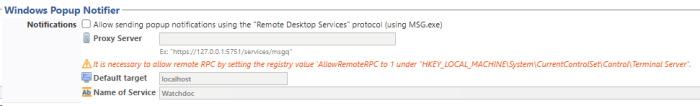 Notifications box: check the box to enable the sending of alert messages using the Remote Desktop Services (RDS) protocol, via the MSG.exe command tool in MS Windows. If you check the box, complete the following field:
