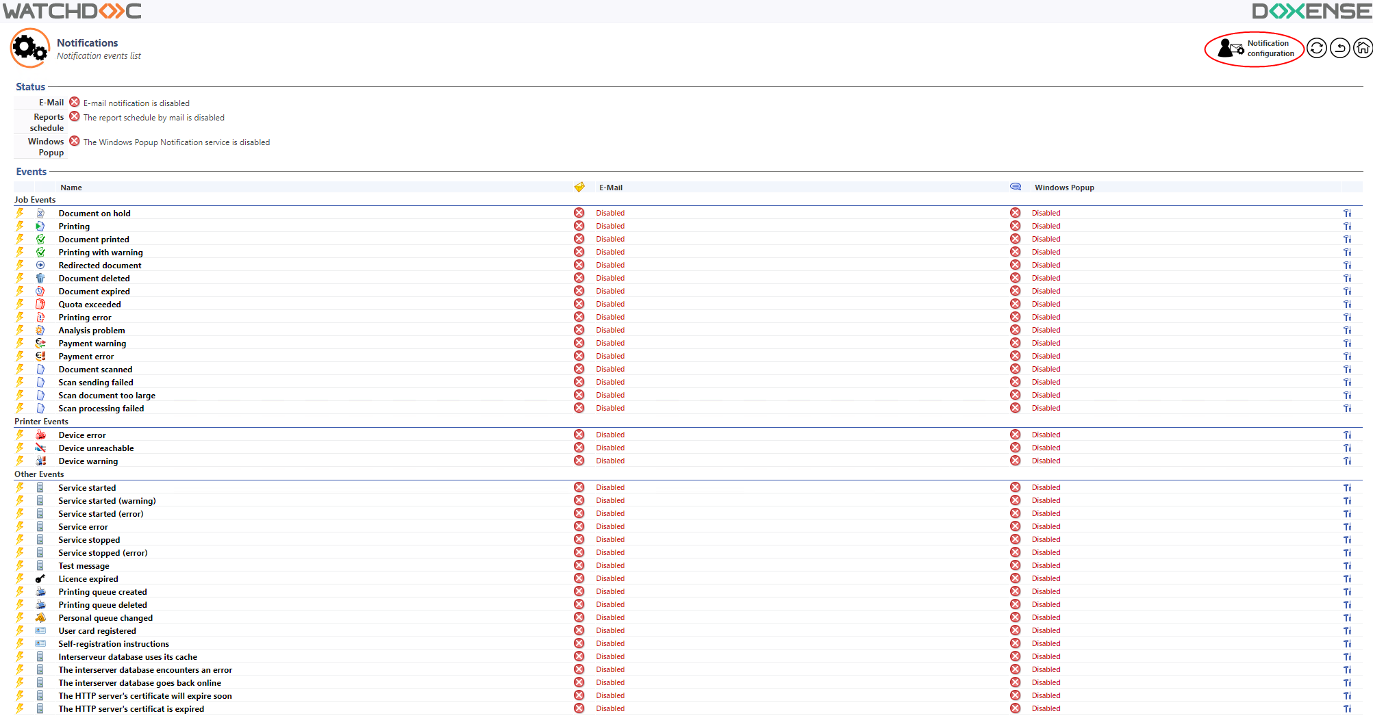 èOnce the notification feature has been configured, you can return to the event list by clicking the Back button. In this list, you can configure the events that trigger a notification.