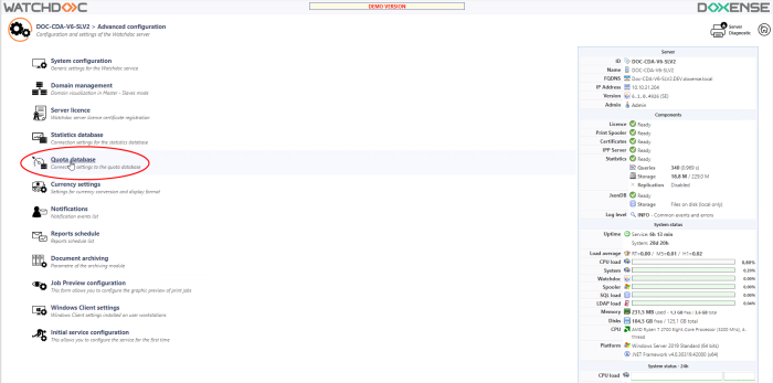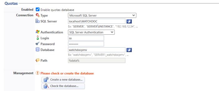 Quotas are based on a specific database, named Watchdocpmv by default (of the SQL® type), declared during the initial installation of Watchdoc.