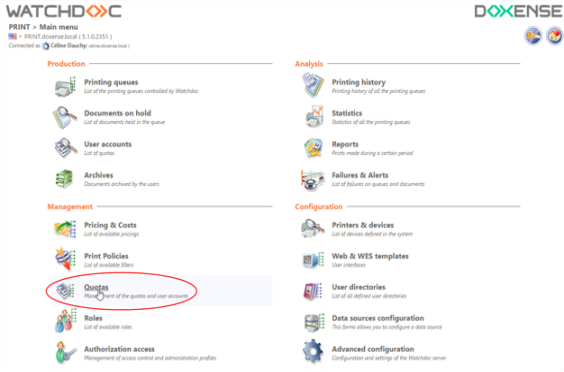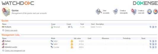 The list displays all of the quotas and management rules declared in the Watchdoc® application: