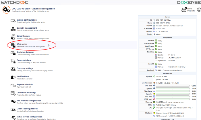 Appeared in version 6.1.0.5262, this section brings together the parameters relating to the Watchdoc web server and the certificates that secure access to it.
