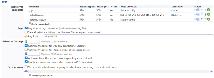Log all incoming connections (in the web server log file): tick the box if you wish to log network activity (each packet request and response) on the DSP server. By default, each web request processed by the server (W3C Log compatible syntax) is logged in a log file on the disk.