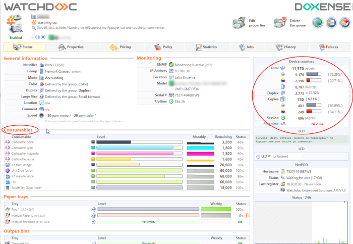 in the Status interface for the selected queue, check that the information on the counters and consumables is collected: