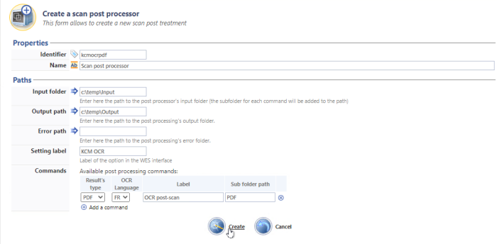 Label: enter here the label under which the processing is presented in the WEScan interface (e.g. "OCR to PDF", "OCR to Word", etc.).