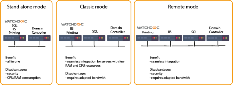 Depending on the installation mode, the SQL database can be installed on a dedicated server or not.