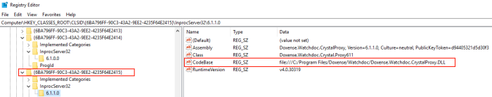 Check that the identifier CLSID 6BA796FF-90C3-43A2-9EE2-4235F64E2415 corresponds to the Doxense ProgID. Watchdoc.Proxy611 points to the Watchdoc 6.1.1 installation folder: C:Program Files/Watchdoc/Doxense.Watchdoc.CrysttalProxy.DLL (default):