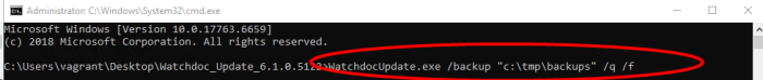Il est possible de lancer une mise à jour de Watchdoc en ligne de commande sans utiliser l'assistant de mise à jour. Lors de cette mise à jour, deux fichiers de sauvegarde de la précédente version sont créés automatiquement (backup_kernel_[n°version_date].zip et backup_web_[n°version_date].zip). Par défaut, ces fichiers sont enregistrés dans le dossier d'où est lancée la mise à jour.