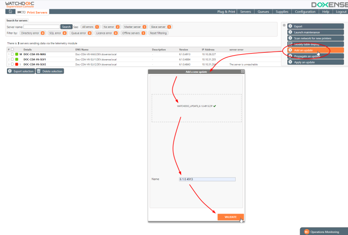 Click the Validate button to launch the update of the designated servers.