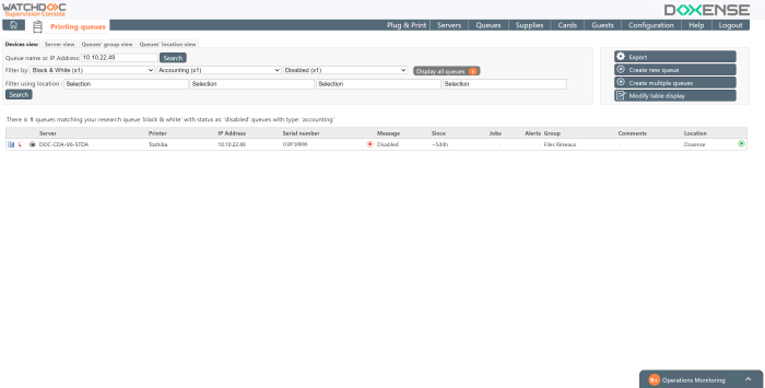 if the server belongs to a domain (master/slaves configuration), Watchdoc deduces the location of the print device using its IP address and the subnet configuration information for the locations. It then compares the IP address of each server with that of the locations to establish the correspondence with the server whose IP address matches. If no server has a matching IP address, Watchdoc sends the queue to the server that manages the fewest queues.