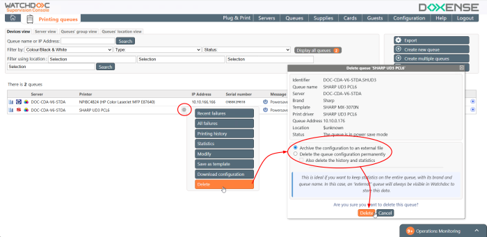 From the WSC print queue management interface, in the queue list, click the button to the right of the name of the queue you want to delete;