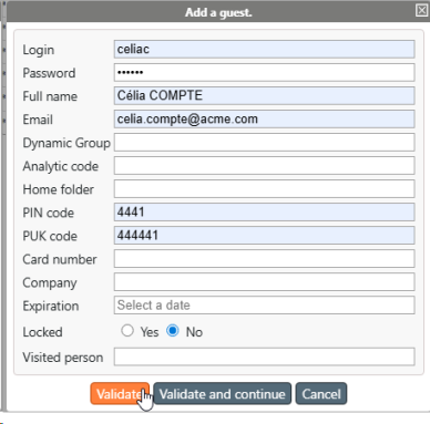Analytical Code: if necessary, enter a cost-account code so that the guest can be associated with a specific account to make it easier to analyse his printing costs (see Analytical codes).
