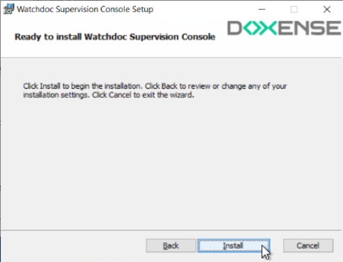 in the Watchdoc Supervision Console setup interface, read the conditions, check the box to accept the conditions, then click on the Install button: