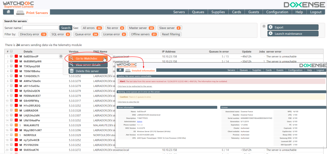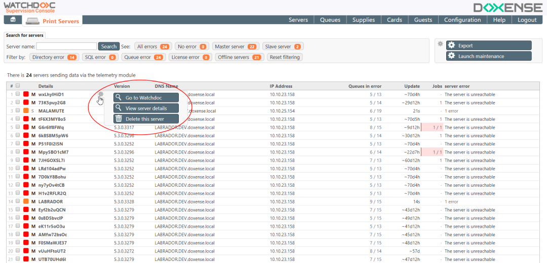 allows you to delete from this list a server that is no more controlled by Watchdoc.