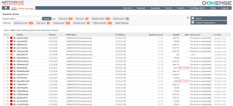 The Supervision Console provides detailed and refined views of the print servers, especially malfunctioning servers.