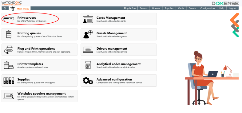 sends to Watchdoc administration interface where you can manage the malfunctioning server after being authenticated as an administrator to check the print queue data); -