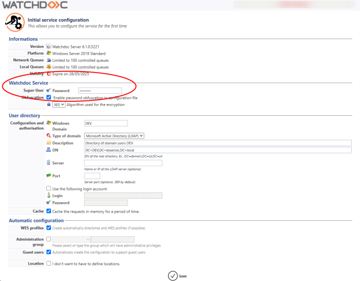 In the Initial Service configuration interface, Watchdoc Service > Super User section, change the default administration password (not necessary, but strongly recommended).