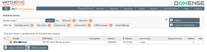 the server on which telemetry has been enabled appears in the list of print servers servers managed by WSC :
