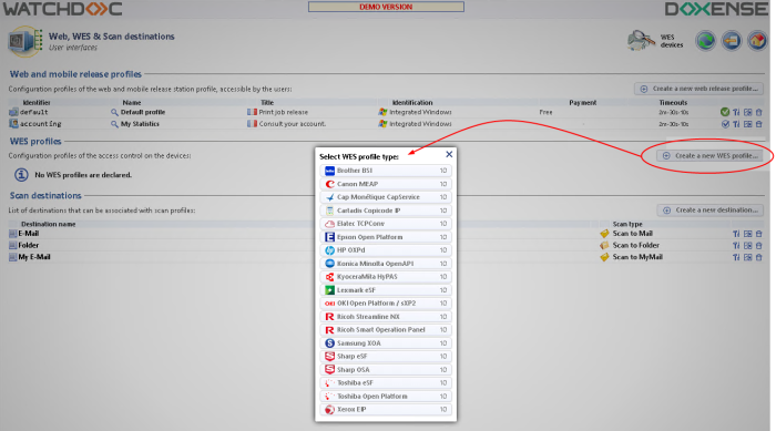From the Main Menu of the Watchdoc administration interface, click on sWeb, WES & Scan Destination.